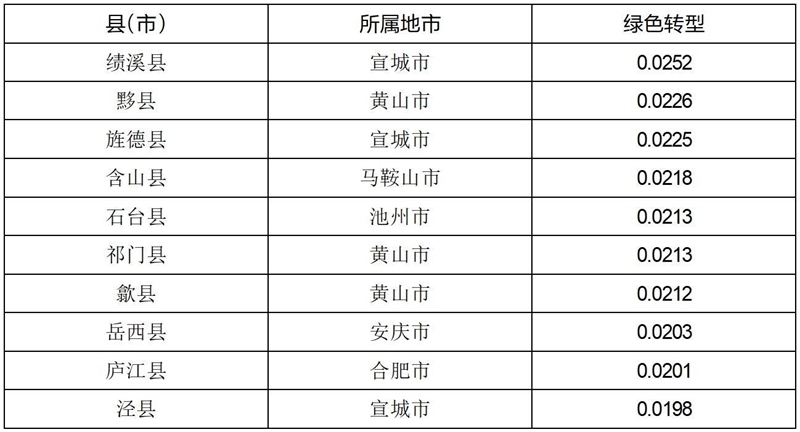 (5)安徽县域绿色转型成长阐发。按照PM2。5年均浓度、单元P能耗量等目标的分析测评成果显示,绩溪县、黟县、旌德县、含山县、石台县、祁门县、歙县、岳西县、庐江县和泾县等县(市)名列前茅。从地域分布来看,这些县(市)次要分布正在宣城、黄山、马、池州、安庆和合肥,呈现出必然的区域集聚特征。