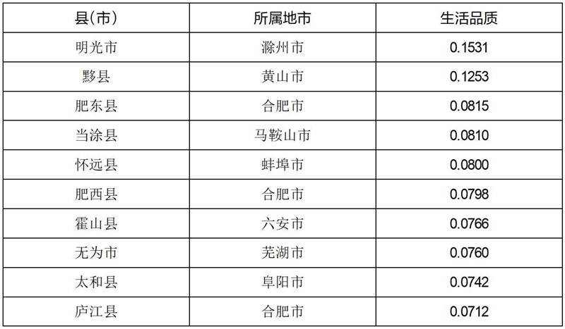 (7)安徽县域糊口质量阐发。按照城镇居平易近人均可安排收入、农村居平易近人均可安排收入、城乡居平易近最低糊口保障人数占比、城乡居平易近加入根基医疗安全参保率、每万生齿卫生手艺人员数和社会消费品零售总额等目标的分析测评成果显示,明光市、黟县、肥东县、当涂县、怀远县、肥西县、霍山县、无为市、太和县和庐江县等县(市)名列前茅。从地域分布来看,合肥有3个县(市)进入全省前十位,滁州、黄山、马、蚌埠、六安、芜湖和阜阳各有1个县(市)进入全省前十位。