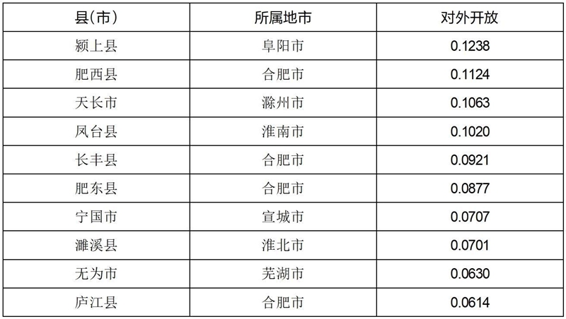 (6)安徽县域成长阐发。按照经济外向度、现实操纵外商间接投资等目标的分析测评成果显示,颍上县、肥西县、天长市、凤台县、长丰县、肥东县、宁国市、濉溪县、无为市和庐江县等县(市)名列前茅。从地域分布来看,合肥有4个县(市)进入全省前十位,阜阳、滁州、淮南、宣城、淮北和芜湖各有1个县(市)进入全省前十位。