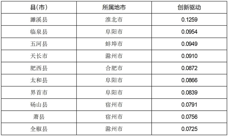 (3)安徽县域立异成长阐发。按照每万人发现专利授权量、财产布局高级化及邮电营业总量等目标的分析测评成果显示,濉溪县、临泉县、五河县、天长市、肥西县、太和县、界首市、砀山县、萧县和全椒县等县(市)名列前茅。从地域分布来看,阜阳有3个县(市)进入全省前十位,滁州和宿州均有2个县(市)进入全省前十位,淮北、蚌埠和合肥各有1个县(市)进入全省前十位。