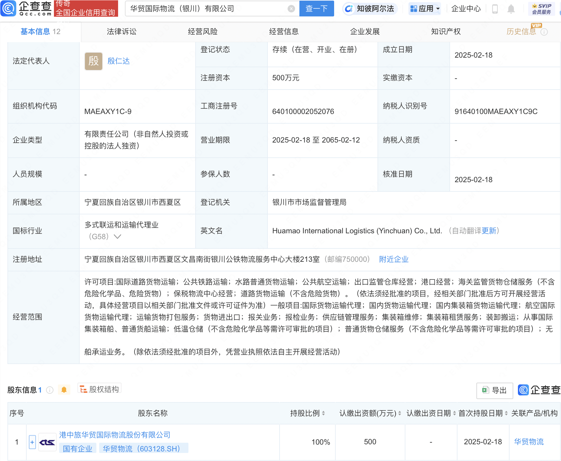 企查查APP显示,近日,华贸国际物流(银川)无限公司成立,代表报酬殷仁达,注册本钱500万元,运营范畴包含:国内集拆箱货色运输代办署理;航空国际货色运输代办署理;运输货色打包揽事;货色进出口等。企查查股权穿透显示,该公司由华贸物流(603128)全资持股。