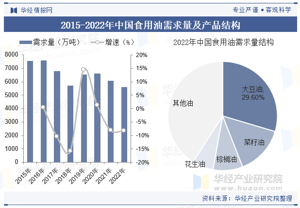 食用油是人们糊口必需的消费品,是供给人体热能和必需脂肪酸,推进脂溶性维生素接收的主要食物。跟着中国经济及出产手艺的成长,食用油行业履历了由定量供应到充脚供应的高速成长过程,近年来,我国食用油需求量呈现出波动下降趋向,2015年中国食用油需求量约为7559。7万吨,2022年下滑至5590。6万吨。从需求布局来看,目前我国食用油的消费次要以大豆油和菜籽油为从,此中大豆油占总需求量比沉为29。6%。