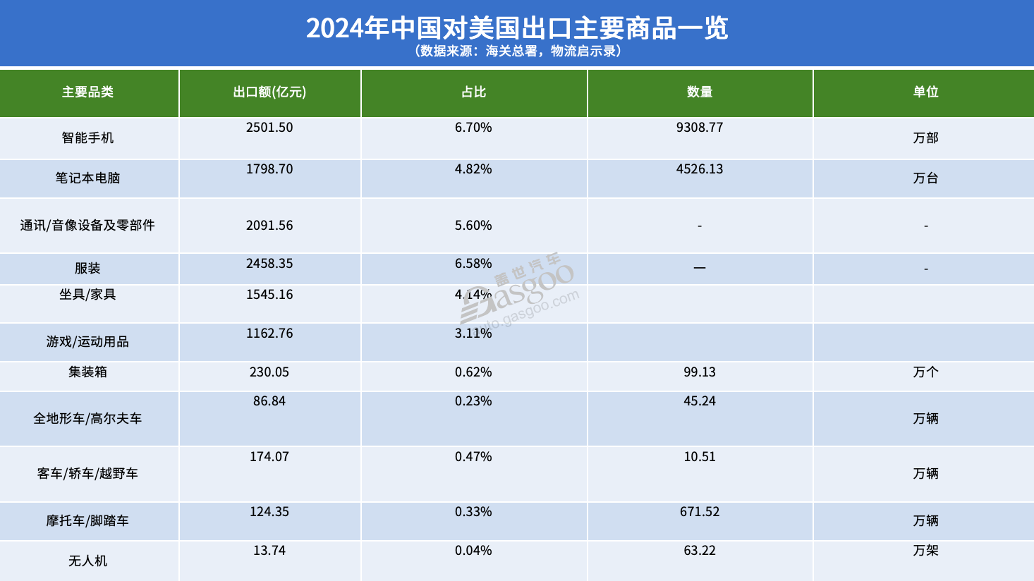 数据显示,2024年,中国对美国的出口总额达到了37337。2亿元,同比增加了4。9%;而从美国进口的商品总额为11640。61亿元,较着呈现商业顺差。通过度析两国的进出口商品布局,能够看出较着的财产互补和分工特点。中国对美国出口的次要产物集中正在机械电子类,达15475。84亿元。此中,智妙手机(2501。50亿元)、笔记本电脑(1798。70亿元)和通信及音像设备及零部件(2091。56亿元)是次要的出口商品。此外,纺织鞋服类产物(4686。26亿元)和家具/玩具/活动杂项成品(4594。61亿元)别离占出口总额的12。55%和12。31%,配合形成了中国对美出口的三大支柱。而中国从美国进口的商品则以高科技和资本类产物为从。机械电子类产物占进口总额的23。17%(2697。30亿元),此中集成电(838。77亿元)和半导体系体例制设备及零部件(319。46亿元)是环节构成部门。值得出格关心的是,中国从美国进口的航空器、航天器及其零件的依存度高达50%,这是中国对美进口依赖度最高的产物类别,表白中国正在航空航天范畴对美国手艺和产物有着较大的依赖。农副食物类占进口总额的16。33%(1901。20亿元),其曲达基因黄大豆的进口额为856。48亿元,占比7。36%。能源类产物则是第三大类进口商品,占比14。12%(1643。34亿元),次要包罗液化丙烷/丁烷(827。44亿元)和原油(428。53亿元)。正在汽车财产方面,中国对美国的出口包罗全地形车/高尔夫车(86。84亿元)、客车/轿车/越野车(174。07亿元)和摩托车/脚踏车(124。35亿元),总出口额为385。26亿元,占出口总额的约1%。取此比拟,中国从美国进口越野车/小轿车/小客车达517亿元,占进口总额的4。4%,显示出中国正在汽车范畴对美国的依赖仍然较大。