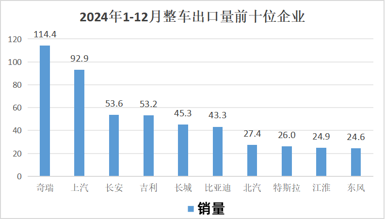 2024年,整车出口前十企业中,从增速上来看,比亚迪出口43。3万辆,同比增加71。8%;长安出口53。6万辆,同比增加49。6%;江淮出口24。9万辆,同比增加46。7%。