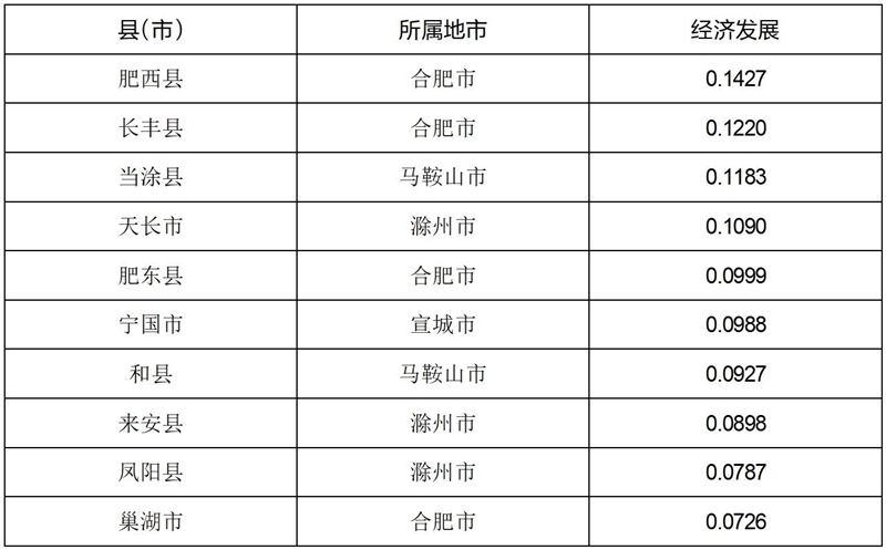 (2)安徽县域经济成长阐发。按照P、P增加率、人均P、工业添加值占P比沉及固定资产投资增速等目标的分析测评成果显示,肥西县、长丰县、当涂县、天长市、肥东县、宁国市、和县、来安县、凤阳县和巢湖市等县(市)名列前茅。从地域分布来看,合肥有4个县(市)进入全省前十位,占领绝对劣势;滁州、马和宣城的县(市)正在全省也具有必然的合作力,别离有3个、2个、1个县(市)进入全省前十位,总体上取高质量成长排名环境较为接近。