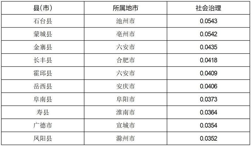 (8)安徽县域社会管理程度阐发。按照城镇新增就业人数、城镇登记赋闲率和一般公共预算财务收入占P比沉等目标的分析测评成果显示,石台县、蒙城县、金寨县、长丰县、霍邱县、岳西县、阜南县、寿县、广德市和凤阳县等县(市)名列前茅。从地域分布来看,六安有2个县(市)进入全省前十位,池州、亳州、合肥、安庆、阜阳、淮南、