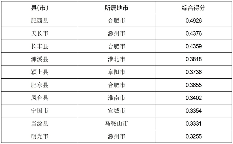 评价目标设想过程中,沉视目标建立的科学性、引领性取前瞻性,既实正在反映现状程度,又成长的好坏势及特点。评价方式次要采用的是客不雅赋权的熵值法。为了确保统计目标建立的科学性以及数据来历的权势巨子性,指数评价所利用数据均来历于2024年安徽省取各地市统计年鉴,以及各县(市)统计公报、工做演讲。(1)安徽县域高质量成长分析阐发。按照表1的25个目标的分析测评成果显示,肥西县、天长市、长丰县、濉溪县、颍上县、肥东县、凤台县、宁国市、当涂县和明光市等县(市)名列前茅。这些县(市)次要分布正在合肥、滁州等经济成长活力较强的市域,核心城市经济社会成长的辐射、溢出效应显著。肥西县、长丰县、肥东县获得了合肥的辐射带动,天长市则通过融入南京、扬州等主要城市,为高质量成长博得了更多机遇。
