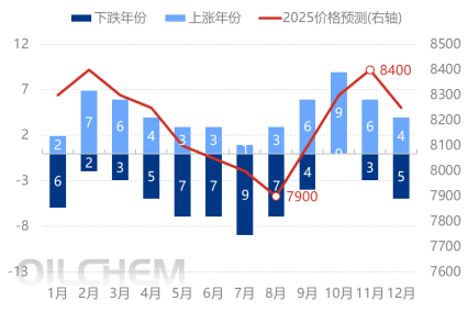 2025年月产量变化根基和2024年变化趋向分歧。因根本油(一类、二类、三类)新增安拆暂无,估计产量变化合适季候性需求变化纪律。6-8月份处于常规性检修淡季,估计产量维持正在低位程度,估计正在41万吨上下震动。金三银四,金九银十保守需求旺季,估计刚性需求支持仍正在,产量存支持点,产量存高预期,估计正在45-47万吨之间变化。