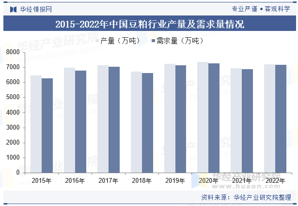 豆粕是食用油行业主要的原材料之一,我国豆粕产量近些年呈现出波动上升走势,2022年豆粕产量约为7207。2万吨,2015年至2022年年均复合增加率为1。6%%;2022年我国豆粕需求量约7169。3万吨,2015年至2022年年均复合增加率为1。88%。