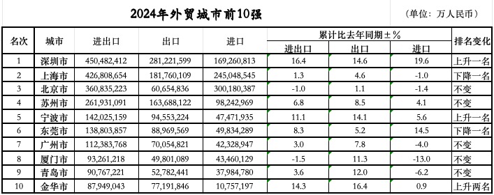 第一财经梳理海关总署的数据,2024年全国外贸前10强城市别离为:深圳、上海、姑苏、宁波、东莞、金华、广州、、杭州和青岛。比宁波更猛的是正在2023年排名第二的深圳,凭仗16。4%的增速跃升至2024年的全国外贸“冠军”。除了时隔9年后沉返内地外贸城市首位,深圳本身也实现了更多冲破2024年4。5万亿元的进出口规模为初次冲破4万亿,16。4%的同比增速别离较全国、广东省快11。4个、6。6个百分点。进口、出口也均为汗青新高,此中,出口2。81万亿元,增加14。6%,实现32连冠;进口1。69万亿元,增加19。6%。记实的恰是深圳一家平易近营企业的出口消息。这张报关单为2024年中国外贸进出口画上了一个句号。也恰是正在这一年,2024年,深圳平易近营企业有进出话柄绩企业数量近4。7万家,企业数量占比近9成,合计进出口3。16万亿元,增加24。2%,快于深圳市全体7。8个百分点,占同期总值的70。1%,比沉较2023年提拔4。4个百分点,成为拉动深圳外贸增加的次要动力。外贸规模则接近8成。数据显示,2024年,宁波的平易近营企业数量已添加至近2。7万家,占同期宁波市外贸企业总数的90。9%,此中,外贸规模超亿元平易近营企业数量添加至1690家。同期,宁波平易近营企业进出口1。09万亿元,增加13%,占全市进出口总值的76。6%。进出口总值从第六名升至第五名之外,宁波的出口规模正在全国城市中排名第四,仅次于深圳、上海和姑苏。另一座正在2024年较着上升的城市是坐拥“世界小商品之都”义乌的金华。从2023年的第12位跻身全国前10强的跃升,也让金华初次超越杭州,位居浙江省第二。浙江金华海关的动静称,2024年金华外贸规模再立异高,共实现外贸进出口总值8794。9亿元,同比增加14。3%,增速居浙江省首位。出口做为其强项,客岁金华出口达7719。2亿元,同比增加16。4%,占浙江省的份额为19。8%,创下汗青新高。金华的进出口近8成由义乌贡献,而义乌的平易近营经济占领了90%以上的市场从体、实现了90%以上的P。2024年前11个月,浙江省义乌市进出口总值就冲破了6000亿元,同比增加17。6%。此中出口5420。6亿元,同比增加17。4%;进口719。3亿元,同比增加19。0%,进出口、出口和进口值占全省份额别离为12。8%、15。2%和5。8%,占比别离提拔1。2、1。1和0。9个百分点。面临全球订单的碎片化趋向,市场采购模式对本地甚至周边的出口具有较着的拉动感化。2024年前11个月,义乌市通过市场采购商业体例出口4350。2亿元,同比增加21。7%,占义乌市出口总值的80。3%,拉动义乌市出口增加16。8个百分点。另据浙江中国小商品城集团股份无限公司数据,2024年,义乌中国小商品市场日均人流22。43万人次,此中日均外商超3900人,创10年新高。除了正在外贸前10强中实现了跃升的城市案例,从全国层面看,平易近营企业的贡献也正在持续提高。2024年,增加8。8%,占全国外贸总值的比沉提拔至55。5%,继续成为外贸第一大运营从体。的数据还显示,2024年的平易近企进出话柄现了三个“初次”,别离是有进出话柄绩的平易近营企业数量初次跨越60万家,达到60。9万家;平易近营企业初次成为我国高手艺产物的最猛进出口从体;平易近营企业占我国消费品进口比沉初次跨越50%,同比提拔2。8个百分点至51。3%,此中正在日化用品、生果等产物中比沉跨越六成。