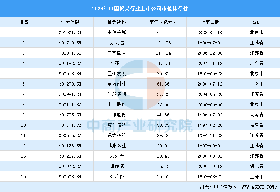 中商谍报网讯:中商财产研究院数据库显示,2024年中国商业行业市值最大的十名上市公司别离是中信金属、苏美达、江苏国泰、怡亚通、五矿成长、东方创业、汇鸿集团、云维股份和厦门信达。