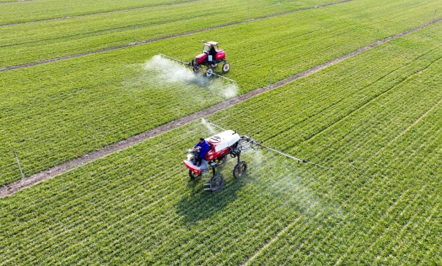 2025年2月18日,正在安徽省亳州市谯城区赵桥乡一处麦田,农人驾驶农机开展田间办理(无人机照片)。发(刘勤利 摄)